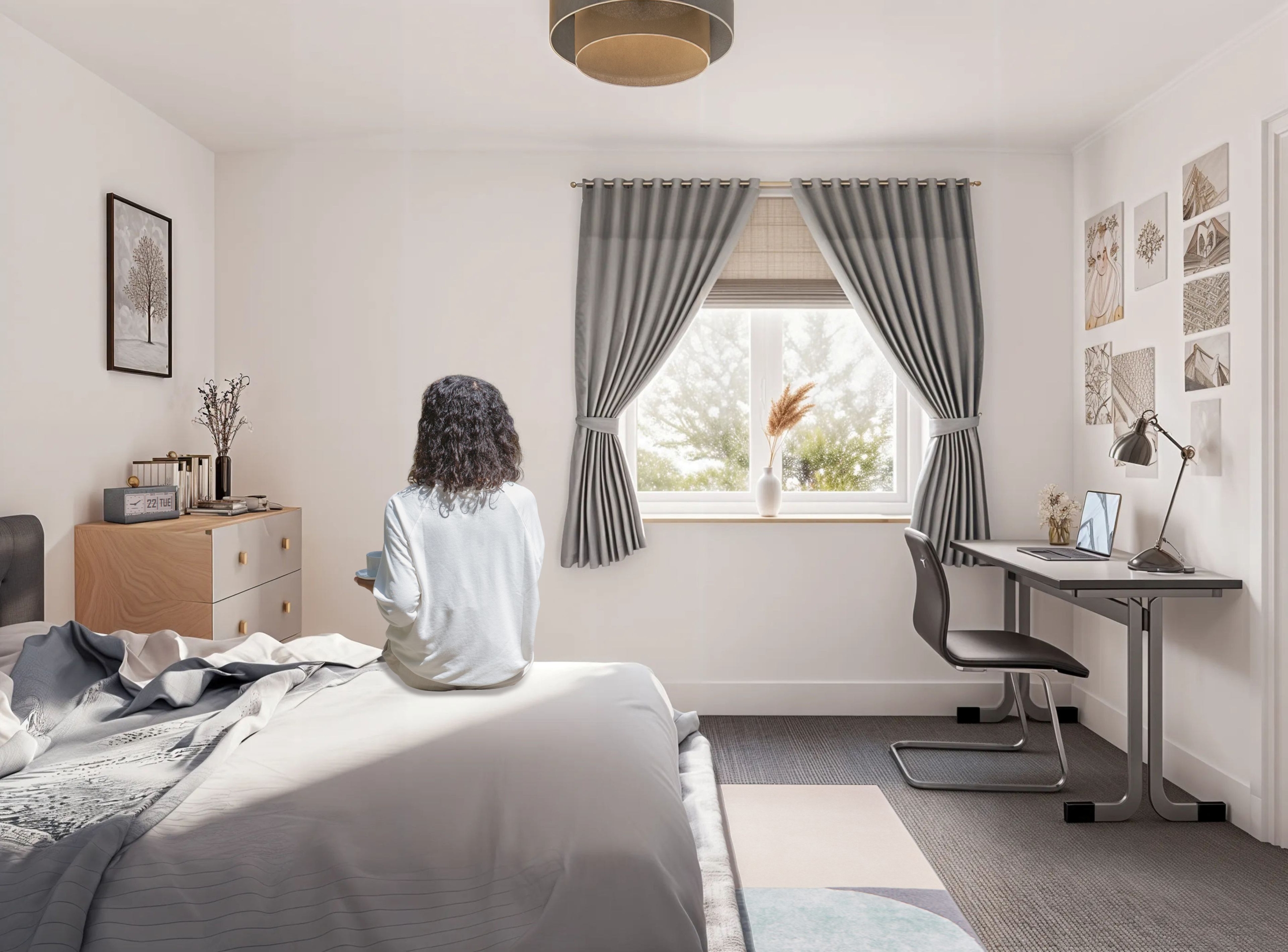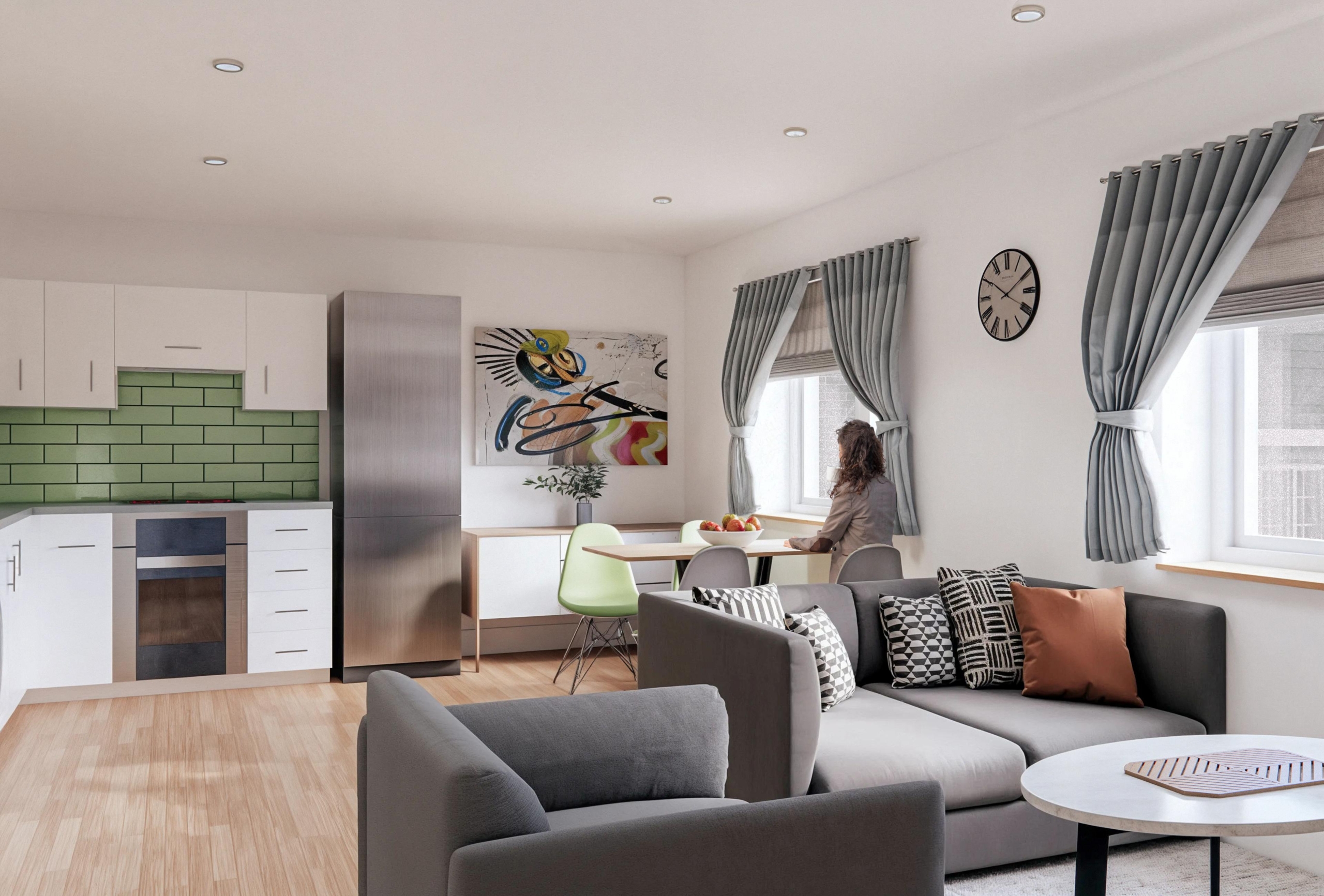 View 360 degree artist’s impressions of the kitchen/living space and bedroom in one of the new flats.
